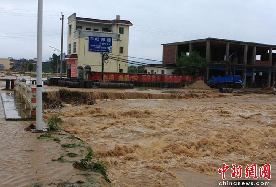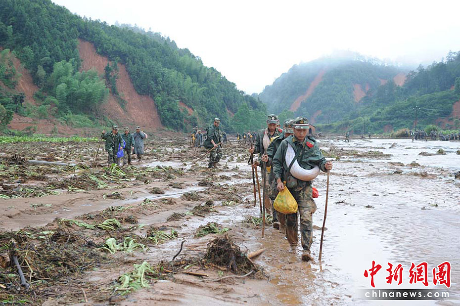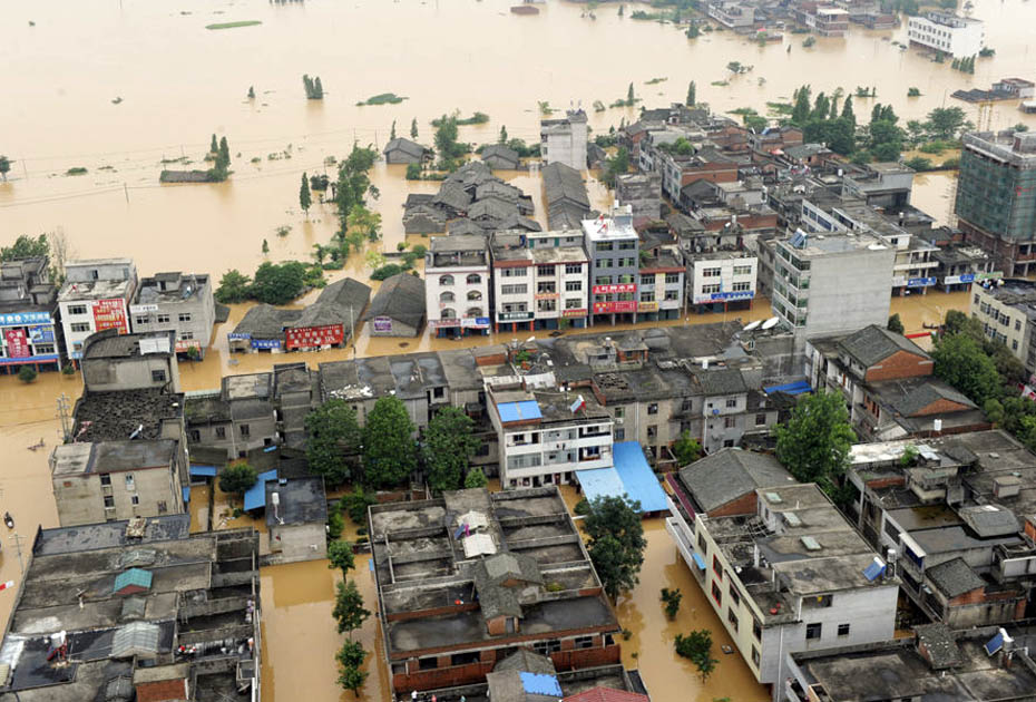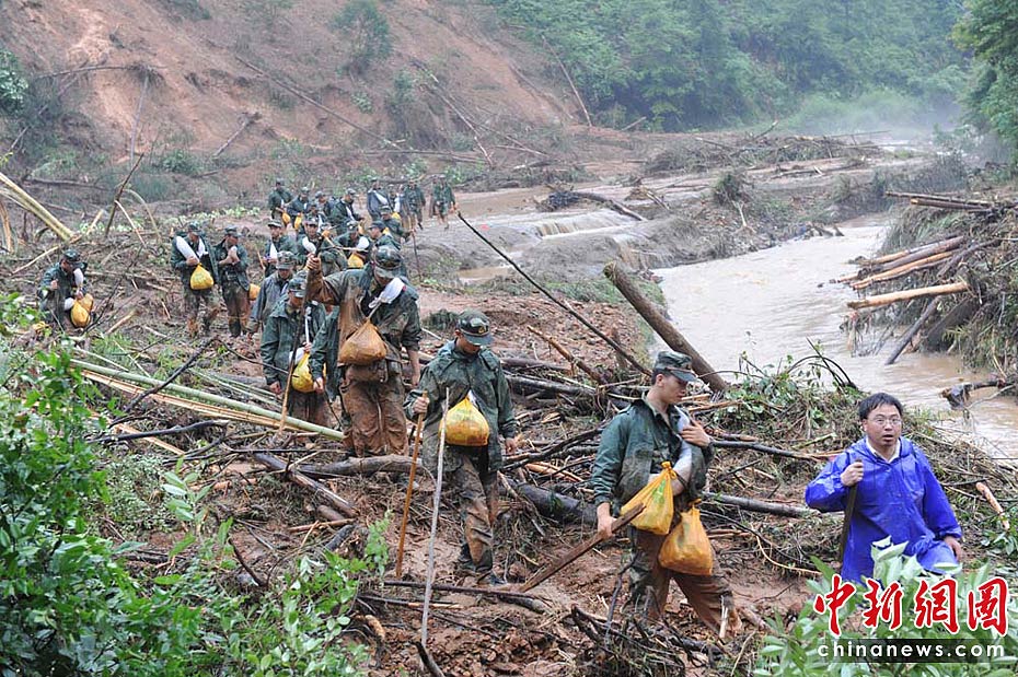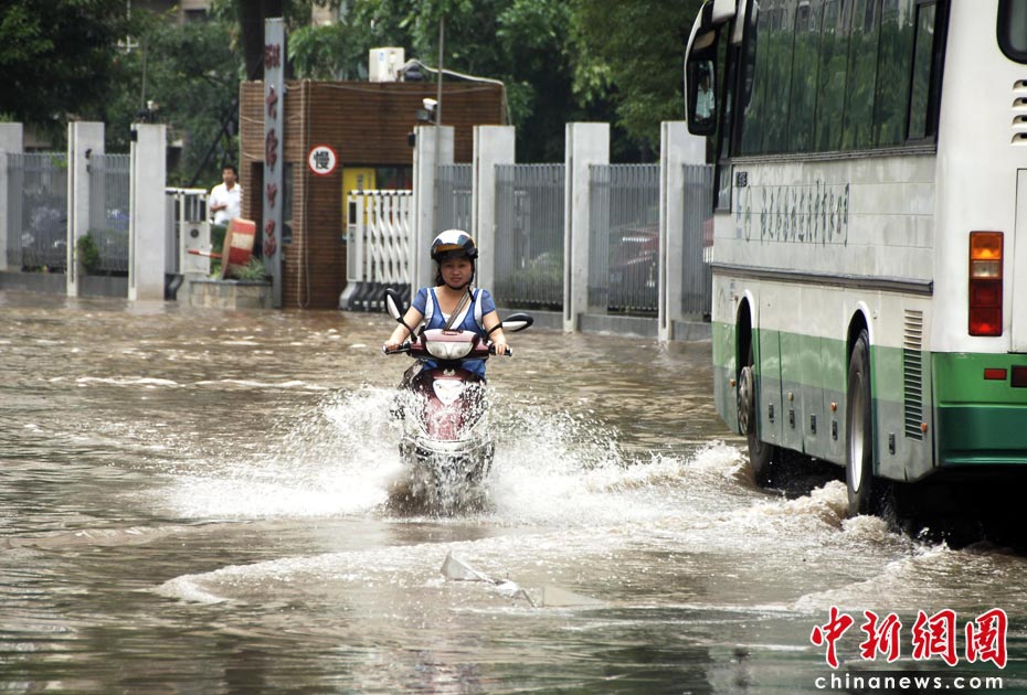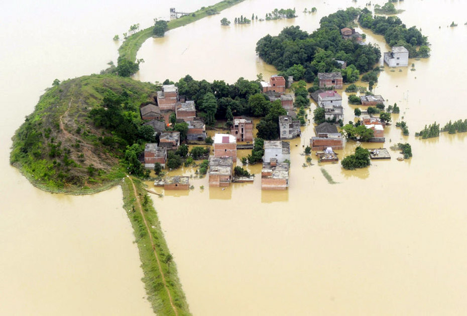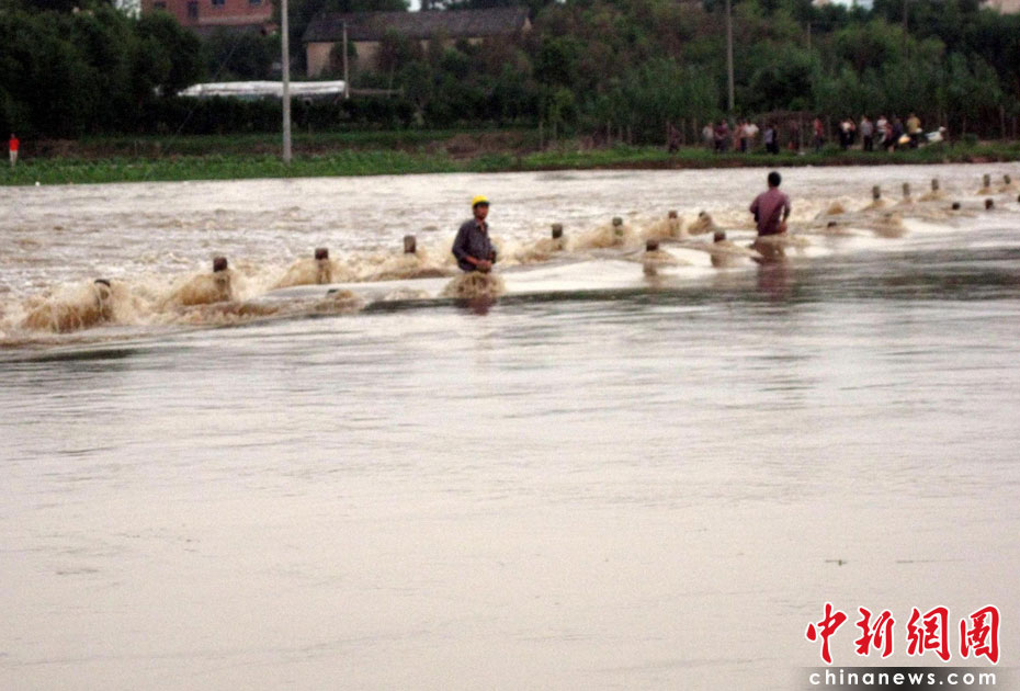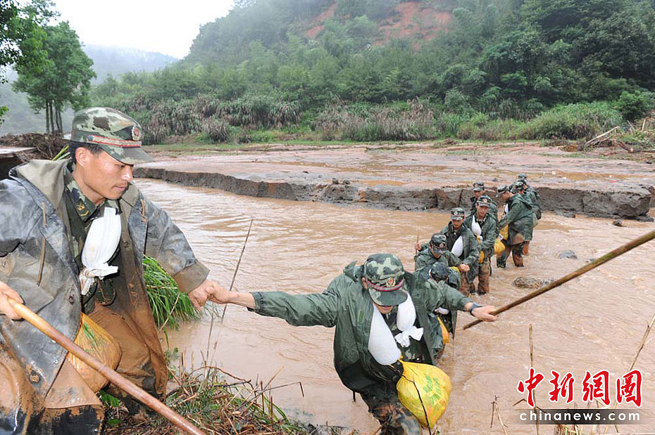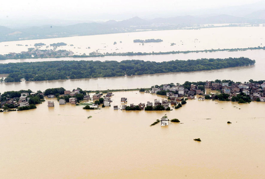 6月19日,在南昌市青云谱区狮子口村,村民扛着家人涉水前行。图片来源:新华网