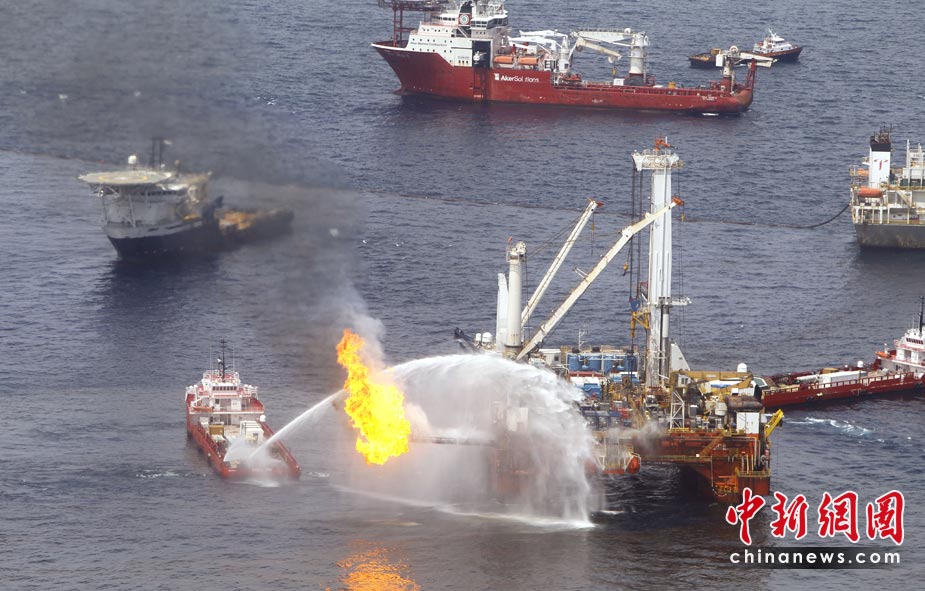 墨西哥湾漏油已经持续两个月,原油仍在源源不断的溢出。近日,在路易斯安那州海岸,为了清理油污、防止油污上岸,清理船大规模燃烧油污。