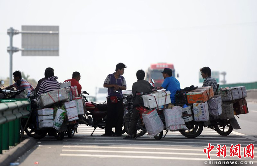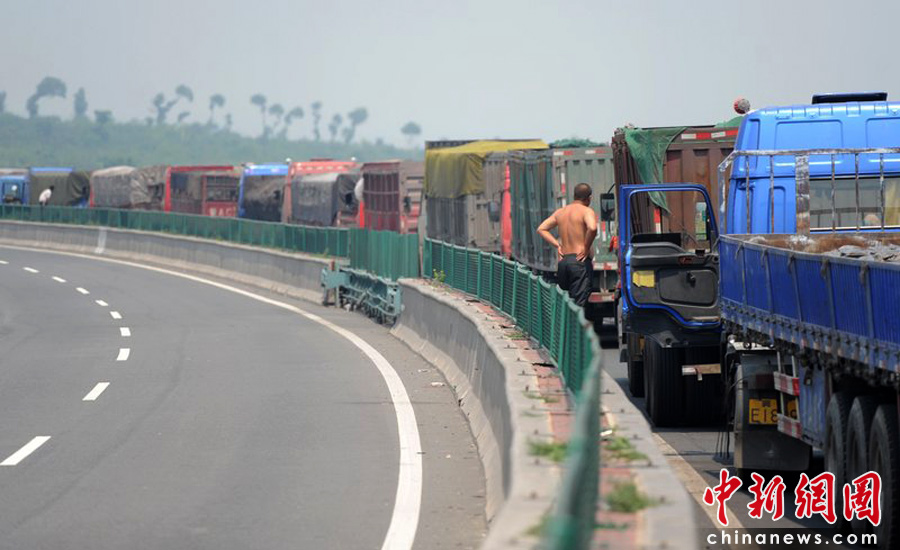 6月21日,施工20天的110国道延庆县境内的四座桥梁维修完毕,道路恢复畅通,但拥堵了20多天的京新高速,缓解情况却不大。几小时走上两三公里的速度,实在让人难以忍受,但长期跑这趟线路的大货车车司机称,车能走动,就已经庆幸了,仅仅10几公里的路,被堵三天三夜的情况以前是经常出现。图为23日在滞留的车队中,不断有开着摩托车的小贩在大货车之间穿插以做点生意。王苡萱/CFP