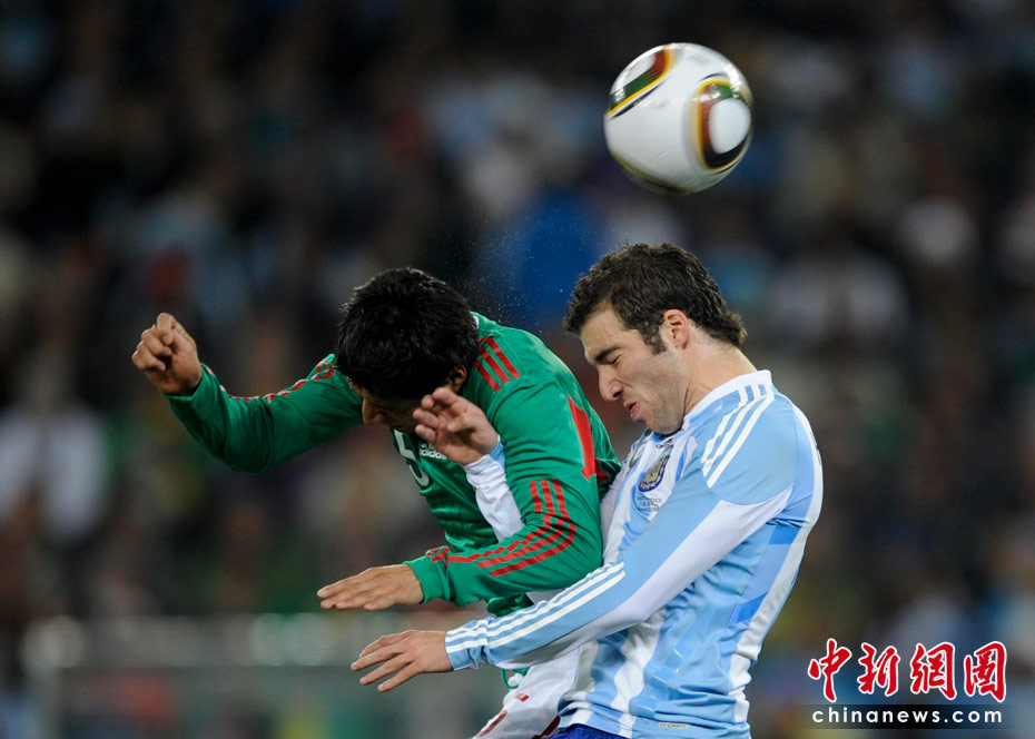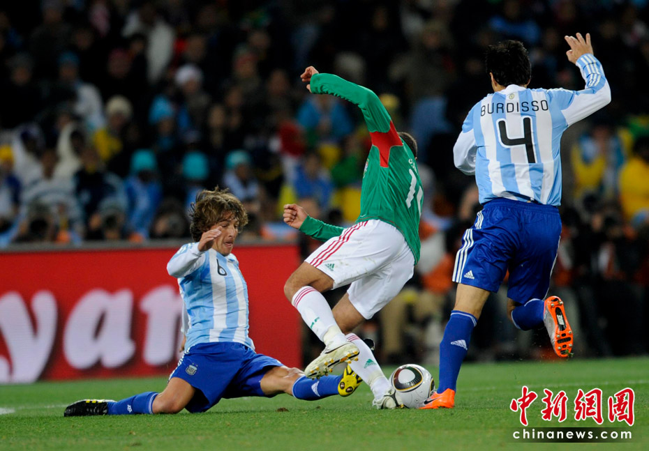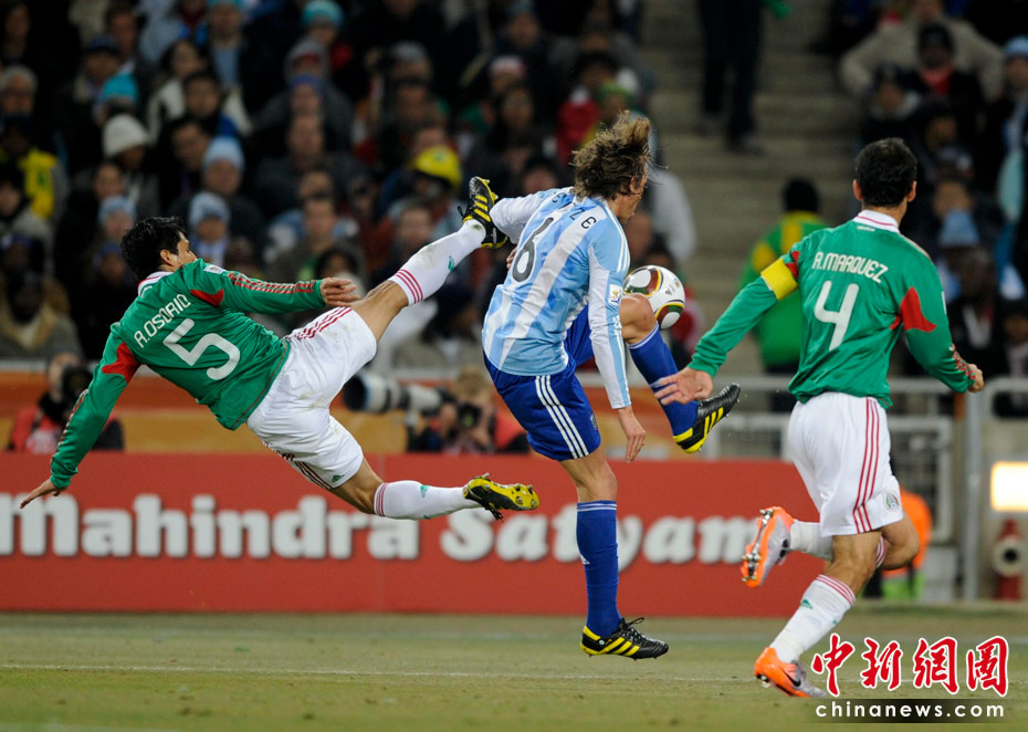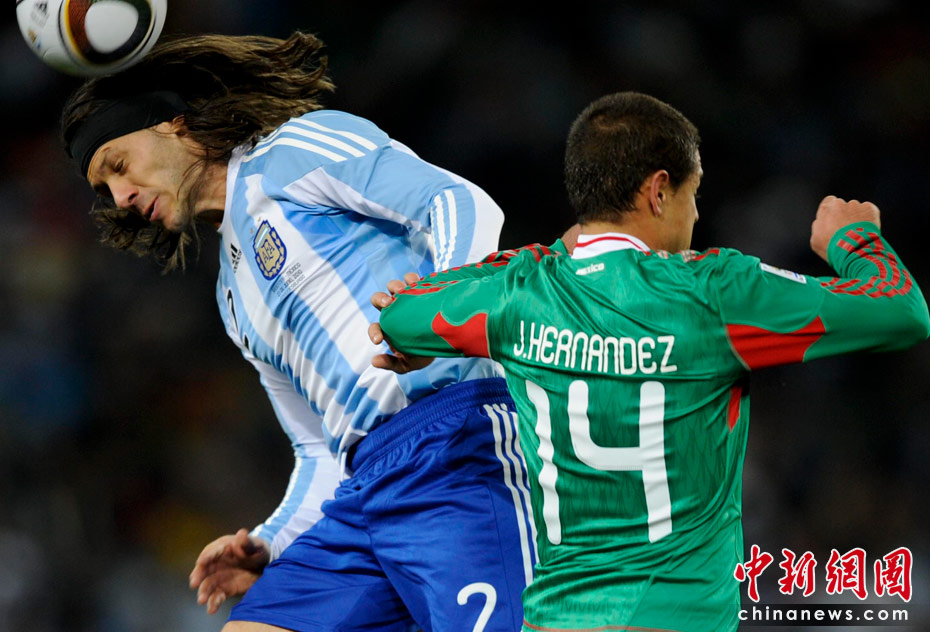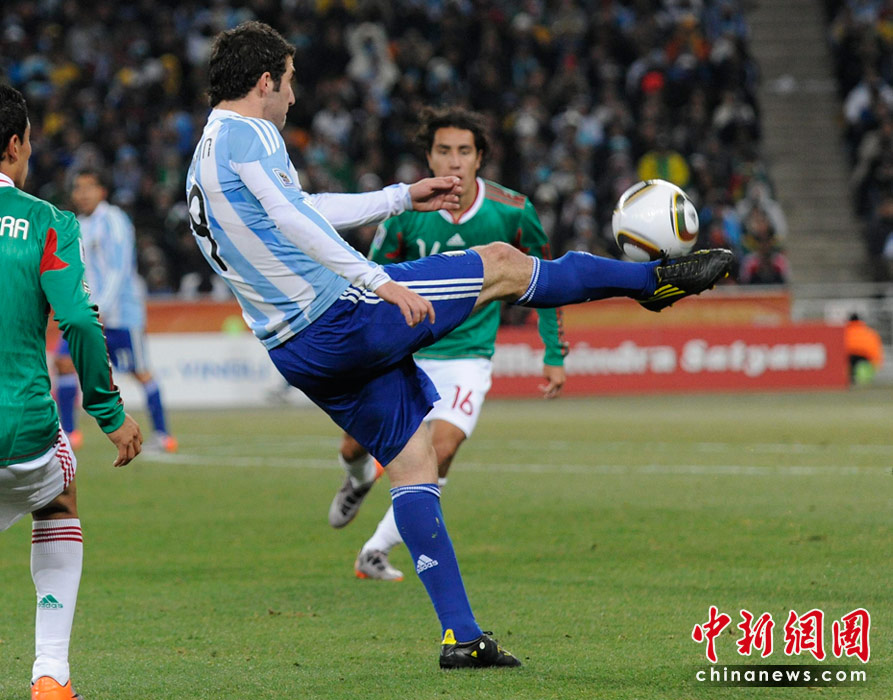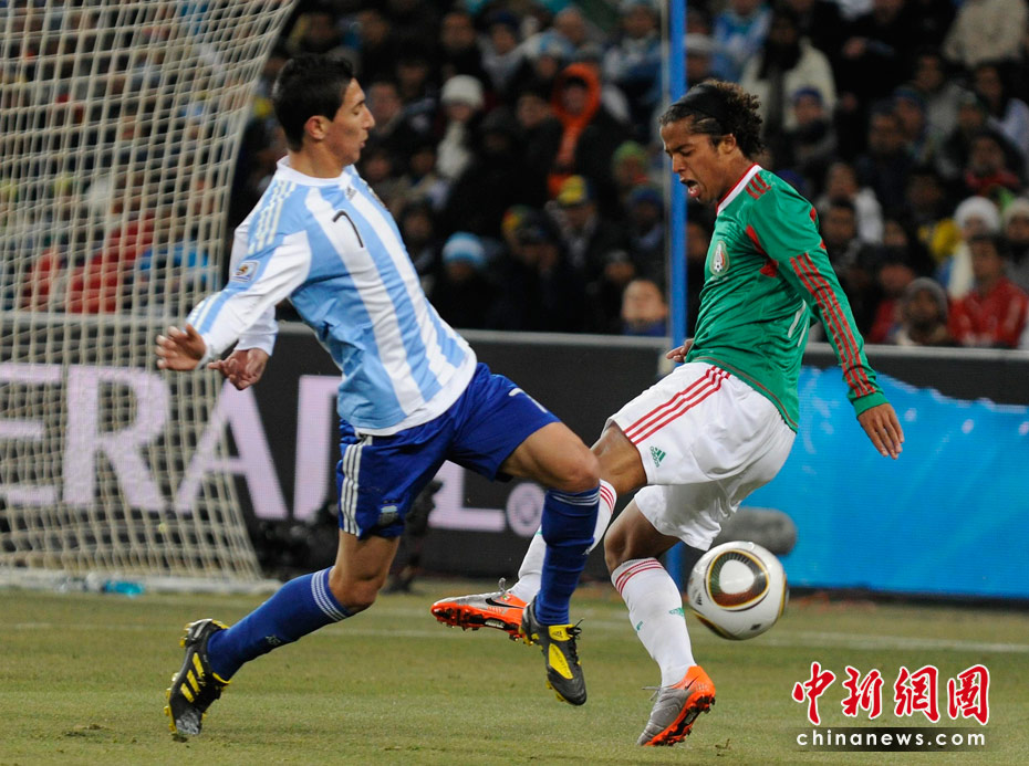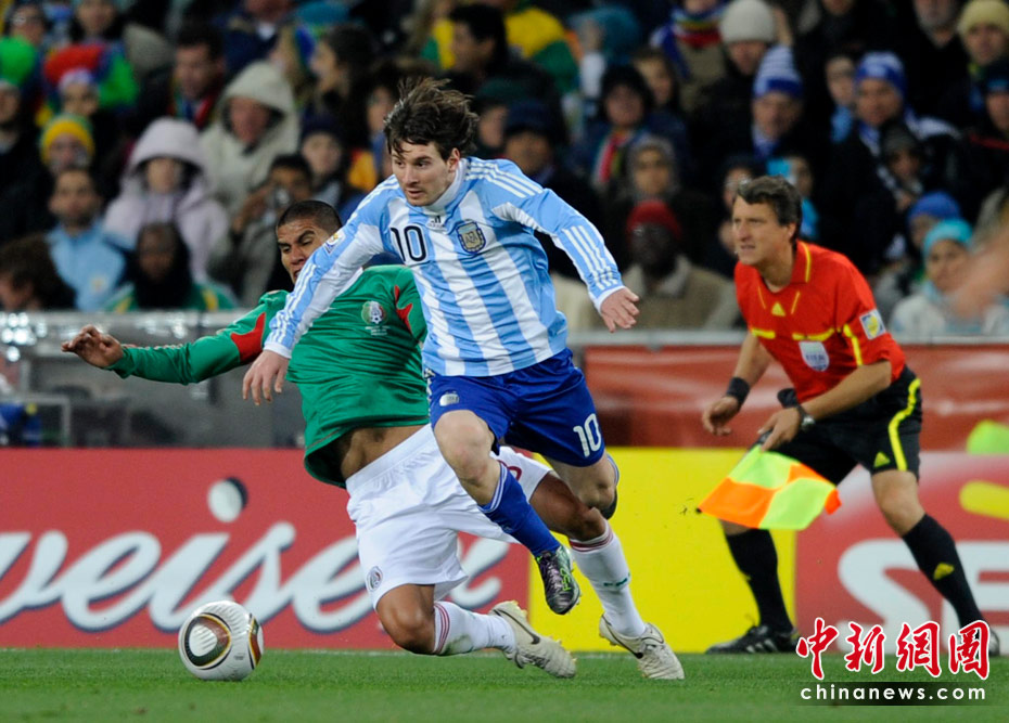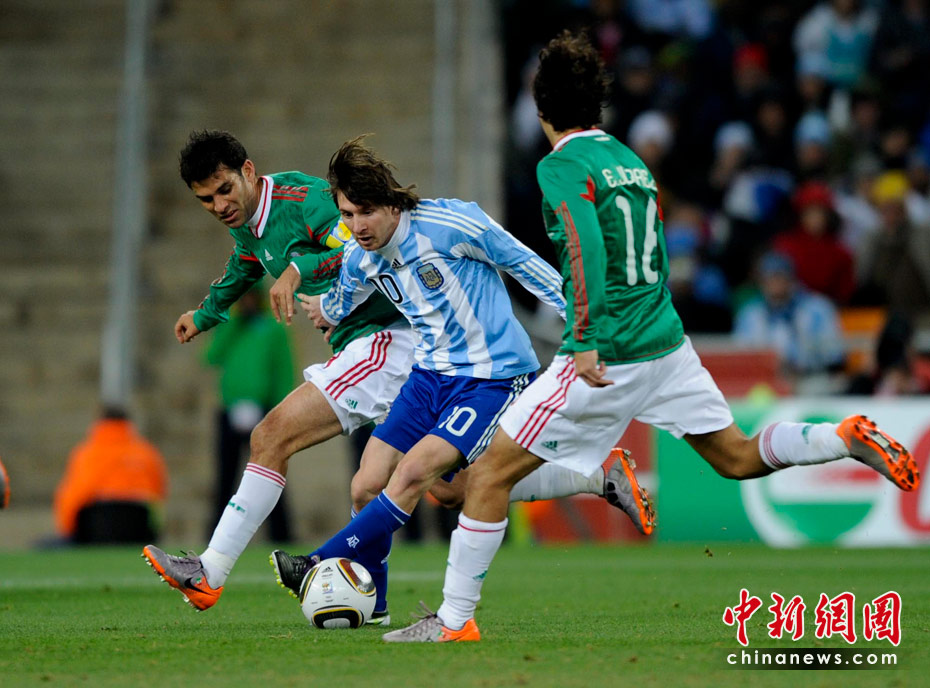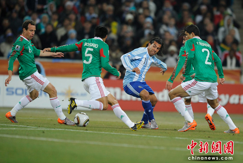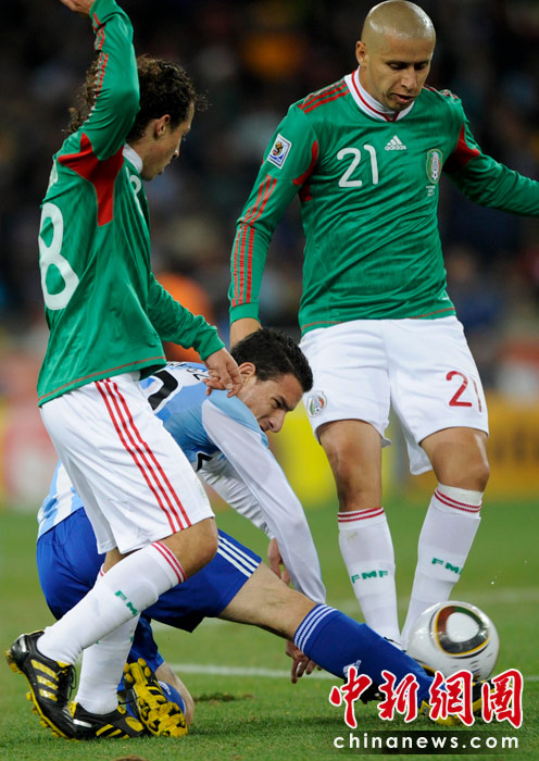北京时间6月28日凌晨2:30,南非世界杯1/8决赛再赛一场,阿根廷队在约翰内斯堡的足球城球场迎来了墨西哥队。凭借特维斯一个明显越位进球首开纪录,随后伊瓜因和特维斯各进一球,以3-1击败墨西哥,晋级八强。 中新社记者 廖攀 摄