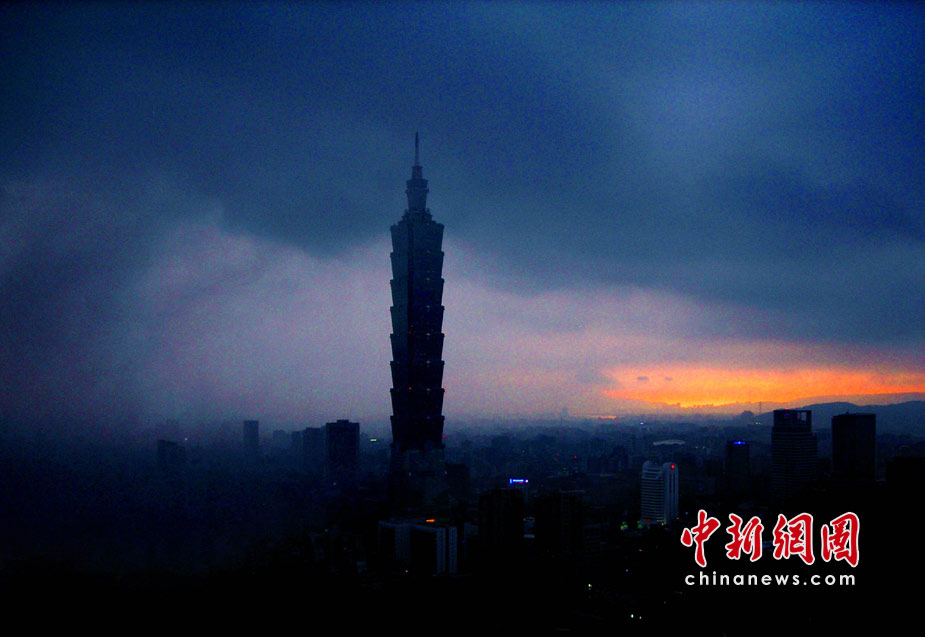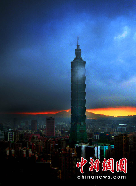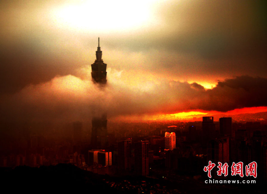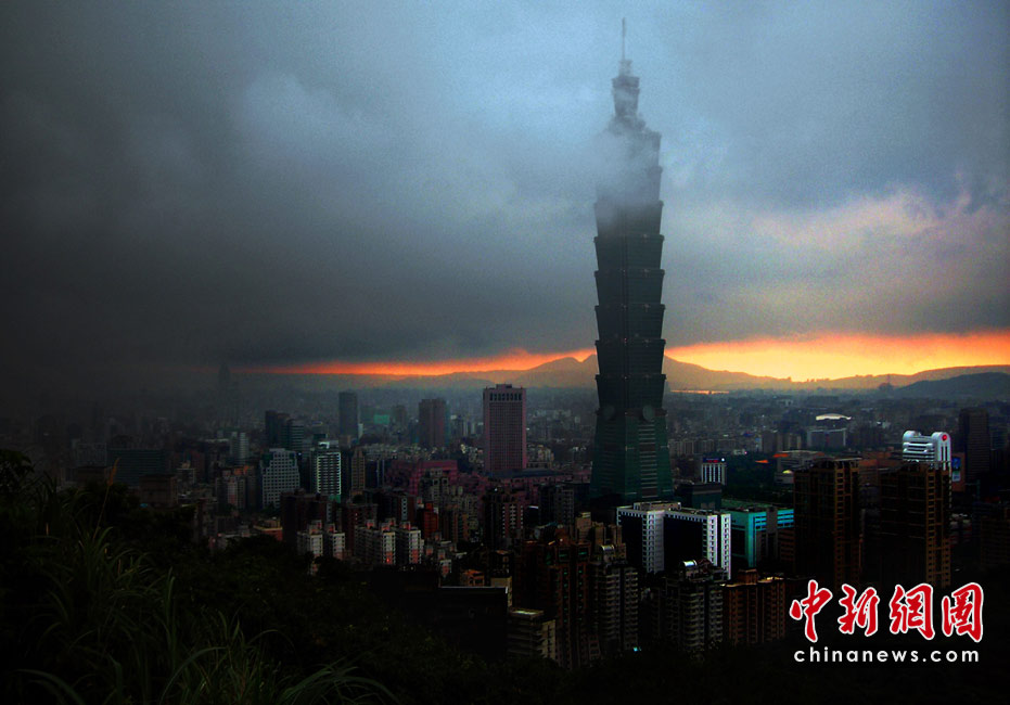 6月28日傍晚,台北市一阵大雨后,从象山俯瞰市区,101摩天大楼耸入云霄,后山红云如火,景观如画。美丽的台北市地处盆地,气候多变,夏季的城市景色也时常变幻莫测。中新社记者 宋吉河摄