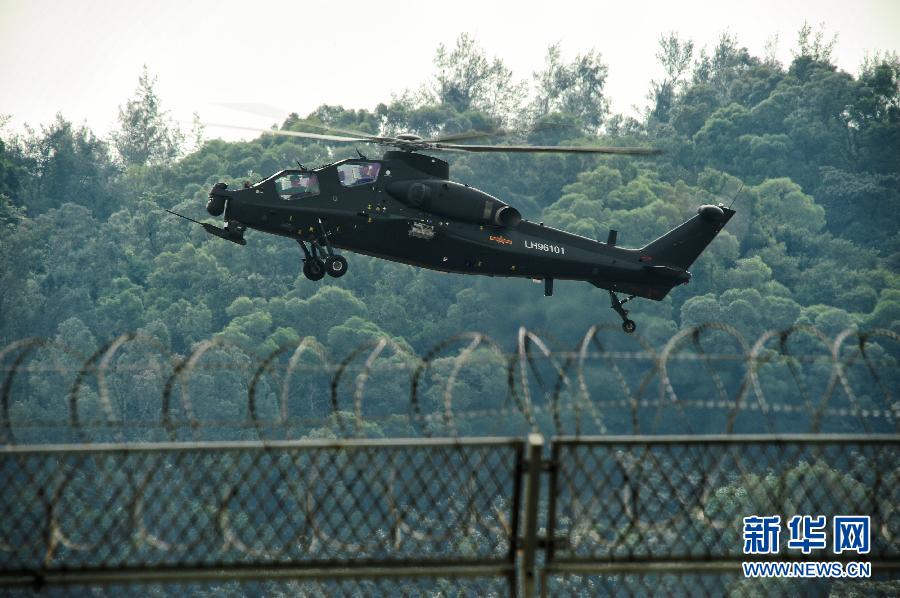 2012年11月11日,国产武直10武装直升机在珠海三灶机场进行飞行训练。当日,我国自主研制生产的武直10武装直升机在珠海三灶机场进行了约20分钟的适应性飞行训练,做出倒飞、莱维斯曼机动、高速大角度俯冲、低空小半径盘旋等动作,展现出其优异性能,引来航展现场观众频频喝彩。杨光 摄 图片来源:新华网