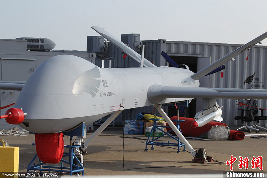 11月10日,广东省珠海市,航展静态展示区的翼龙无人机。中航工业自主研制的“翼龙”无人机将在11月13日至18日的珠海航展上静展。图为航展静态展示区的翼龙无人机。钟凡 摄 图片来源:CFP视觉中国