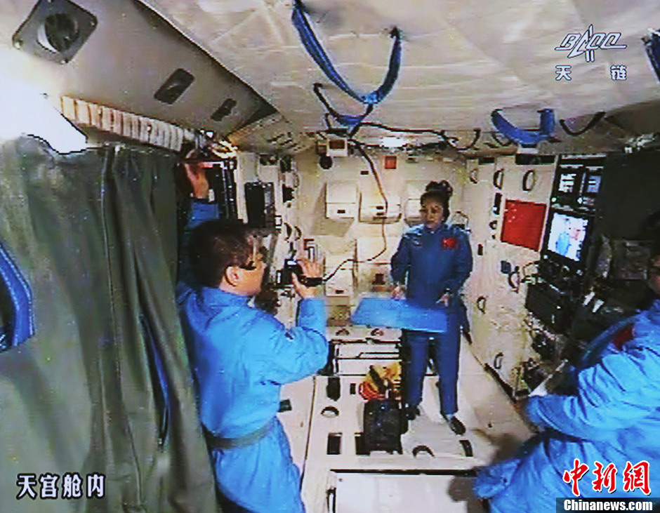 6月20日10时许,神舟十号航天员在天宫一号开展基础物理实验,为青少年进行中国首次太空授课。图为实时画面。中新社发 秦宪安 摄