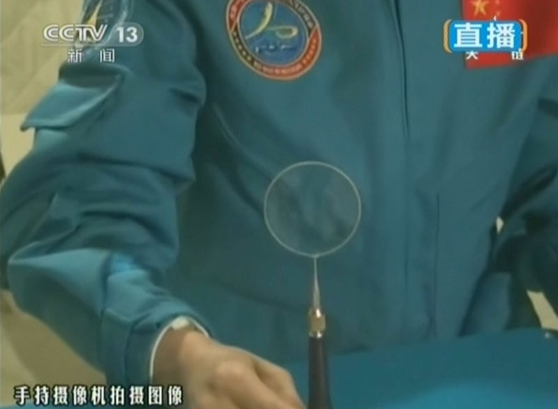 6月20日上午10时许,神舟十号航天员进行中国首次太空授课,女航天员王亚平担任主讲,成为中国首位“太空教师”。图为王亚平进行“水膜”演示。(视频截图)