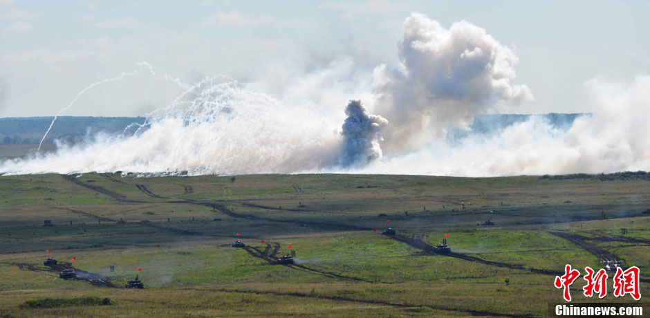 8月12日12时(北京时间下午2时),“和平使命-2013”中俄联合反恐军事演习,在俄罗斯切巴尔库尔合同训练场进行了实兵实弹协同训练。图为中方装甲车成攻击队形向敌纵深发展攻击。中新社发 谭长俊 摄
