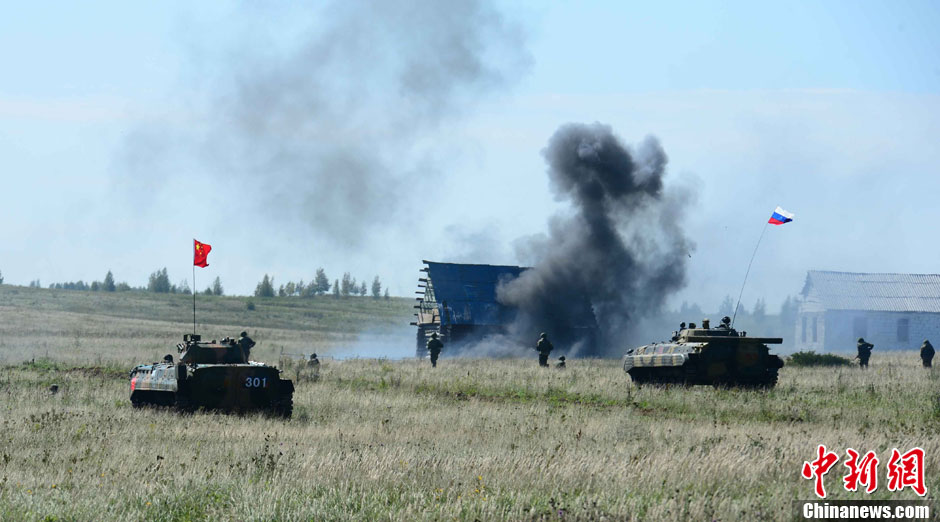 8月12日12时(北京时间下午2时),“和平使命-2013”中俄联合反恐军事演习,在俄罗斯切巴尔库尔合同训练场进行了实兵实弹协同训练。图为中俄双方参演官兵共同向前推进清剿残敌。中新社发 谭长俊 摄