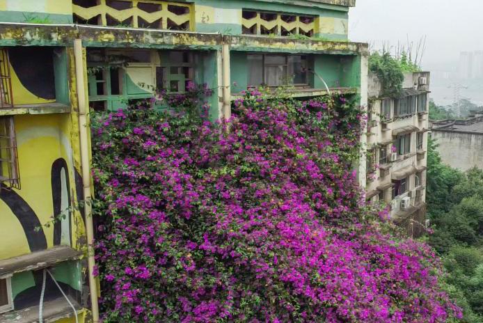 5月25日,重庆市九龙坡区黄桷坪涂鸦艺术街,一居民楼盛开的三角梅从8楼倾泻至地面,高近30米,远望如“花瀑”流淌,形成一道靓丽风景线。蒋杭佳 摄