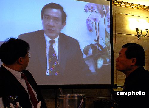 当地时间3月30日,大纽约区侨界支持马英九竞选后援会成立大会上,放映了马英九在台湾向侨界发表讲话的录像,他表示要致力改善两岸关系,追求双赢局面。据悉全美各地侨界将成立十二个马英九竞选后援会。中新社发 龚文谟 摄