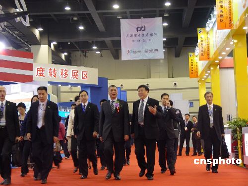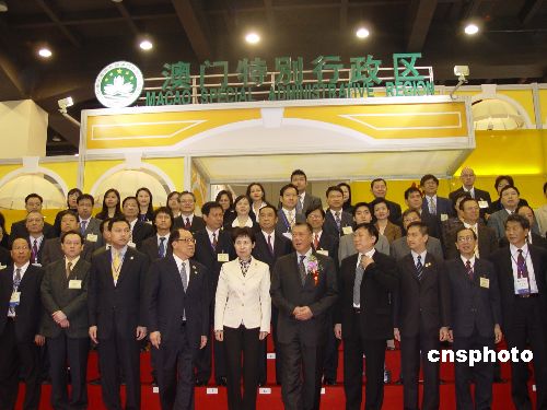 四月二十六日上午九时许,抵豫出席第二届中国中部投资贸易博览会的澳门特首何厚铧,在中国郑州国际会展中心巡看展会情况。中新社发 李志全 摄