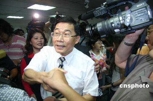 “高雄地方法院”经过近半年审理于六月十五日下午一审宣判现任高雄市长陈菊当选无效 。宣判结束后,中国国民党高雄市长候选人黄俊英(中间者)在旭理法律事务所召开记者会,向前来祝贺的人们表示感谢。黄俊英说,这是迟来的正义、高雄市民的正义,希望日后台湾的选举都能以此为戒,不能让劣质的选举花招继续伤害台湾的民主。中新社发 耿军 摄