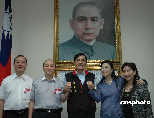 回台参加中国国民党第十七次全国代表大会第二次会议的七十余名海外华人华侨,六月二十五日在国民党中央总部成立“海外马萧后援会”筹备会,马英九到会与海外代表们见面。图左三为马英九,右二为蒋方智怡。中新社发 王辛莉 摄