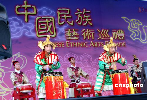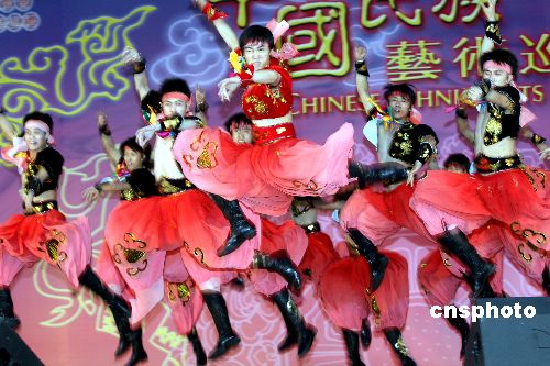 香港中秋彩灯会暨中国民族艺术节巡礼九月二十一日晚在维园举行节目预演,大陆多位著名艺术家和多个艺术团超过150人进行表演。图为中央民族大学学生表演蒙古族男子群舞-马背旋风。为庆祝中秋节,香港康乐及文化事务署一连四晚在多个地方举行中秋彩灯会,让全港市民共贺佳节。中新社发 王丽南 摄