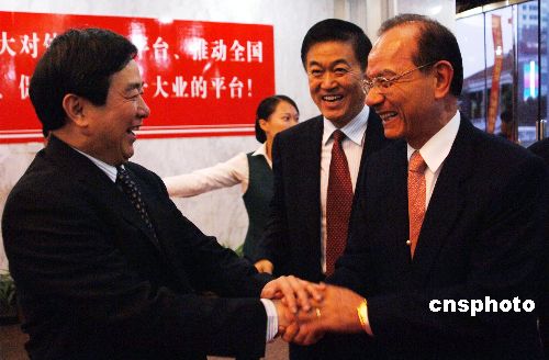 十一月十七日,福建省委常委、常务副省长张昌平(中)、漳州市市长李建国(左)在漳州与中国国民党副主席林丰正(右)交谈甚欢。第九届海峡两岸花卉博览会将于十八日在福建漳州隆重开幕,届时,岛内外五百多名台商将出席盛会。中新社发 王东明 摄