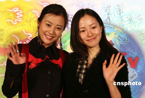 十二月四日,大陆知名演员郝蕾(左)、江一燕在台北参加“二00七台湾国际影视创投会”开幕式,成为媒体竞相拍照的焦点。中新社发 董会峰 摄
