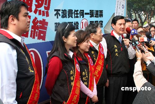 图为国民党二00八“大选”参选人马英九到“中正运动广场”为行将出发的该党台北市党部宣传车队加油打气。
