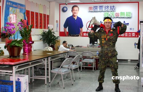 一月十一日,台湾第七届“立委”选举进入最后冲刺阶段。图为在台北市西园路的一名“立委”候选人竞选总部内,身着戎装的支持者正准备出发去扫街拜票。中新社发 陈立宇 摄