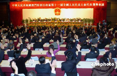 一月二十七日,澳门特区第十一届全国人大代表选举会议举行全体会议,三百一十九名选举会议成员投票选出十二名第十一届全国人大代表。李沛霖、招银英(女)、林笑云(女)、姚鸿明、高开贤、陆波、崔世平、梁玉华(女)、梁维特、贺一诚、刘焯华、刘艺良十二人当选第十一届全国人民代表。图为大会会场。中新社发 史利 摄