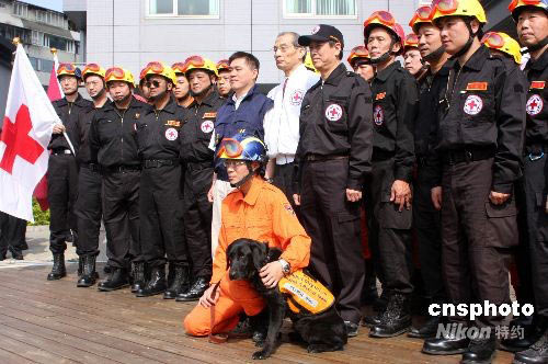 五月十六日上午,台北市长郝龙斌在台北市灾害应变中心向救援队授旗,加油打气。由台湾红十字会组织派遣的救援队一行二十二人和一只搜救犬五月十六日下午将乘包机直飞四川救灾。台湾红十字会组织派遣的这支救援队隶属于台北市。中新社发 陈立宇 摄