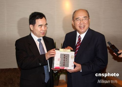 图为吴伯雄向柳斌杰赠送台湾的“太峰高山茶”。