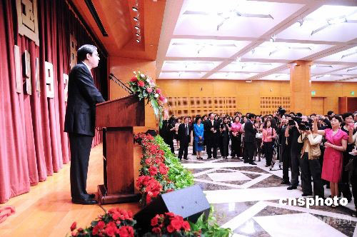 中国驻美大使周文重大使美东时间九月二十八日晚在驻美大使馆新馆举行华侨华人国庆招待会。图为周文重在大使馆新馆国庆招待会上致辞。中新社发 邱江波 摄