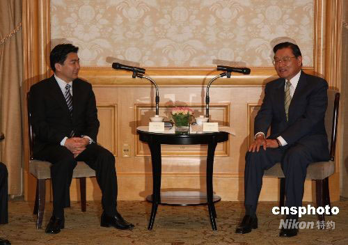 台湾海基会董事长江丙坤(右)十月一日在台北西华饭店会见前来台湾参访的中共江苏省委常委、苏州市委书记王荣。经常到苏州看望台商的江丙坤,希望苏州在中小台资企业融资、劳动合同法的实施及台资企业后续发展的土地三个问题上,更多地向台商提供辅导和协助。中新社发 耿军 摄