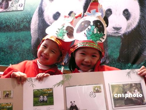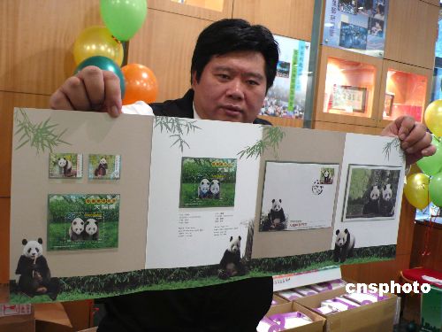 1月20日,为庆祝大陆赠台两只大熊猫“团团”“圆圆”到台湾落户,台湾“中华邮政”举行“可爱动物邮票——大熊猫”邮票及邮折发行典礼。本次发行的大熊猫邮票一组含邮票两枚及小型张一张,分别为大熊猫团团(面值新台币五元)、圆圆(面值九元)和团团圆圆小型张(面值二十五元),各发行一百万张。“可爱动物邮票——大熊猫”邮折一本,内含上述大熊猫邮票一组、小型张样张一张、贴有团团邮票的首日封及原图明信片一组三张,每本售价新台币一百八十元,限量二万五千套。中新社发 路梅 摄