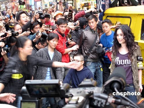 三月十一日,艺人不雅照女主角之一的钟欣桐(阿娇)复出后首次现身香港闹市街头,引来数百人围观,争相拍摄。阿娇复出后首份工作是担任一个牛仔裤品牌的代言人,当日出席该品牌一分店的宣传活动。中新社发 黎金良 摄