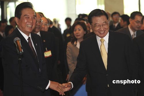 4月25日,陈云林在南京紫金山庄迎接江丙坤一行。海协会和海基会第三次会谈26日将在南京紫金山庄举行。中新社发 廖攀 摄