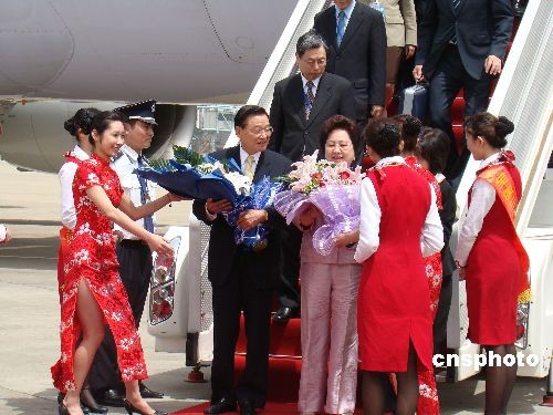 4月25日上午11点左右,海基会董事长江丙坤一行抵达南京禄口机场,参加将于26日举行的第3次“陈江会”。中新社发 丁梅 摄