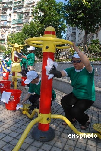 为防控甲型H1N1流感,澳门多个政府机构和社团五月七日启动“全民齐抗疫”系列活动。图为市民在佑汉公园清洁公共设施。中新社发 毕永光 摄