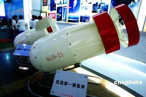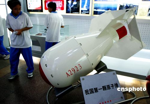 为庆祝中国人民解放军建军80周年而举办的国防和军队建设成就展览,于7月16日在北京的军事博物馆开幕。图为展览上展出的中国第一颗原子弹和氢弹的模型。中新社发 宋吉河 摄