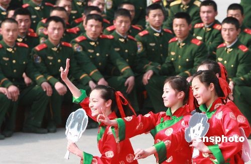 2月22日,武警江苏总队文工团演员为苏州武警官兵表演舞蹈。当日,武警江苏总队政治部文工团组织“慰问抗雪救灾一线官兵及新战友专场文艺巡演”之首场演出活动,在苏州武警支队新兵营训练场热闹开演。中新社发 苏秀 摄