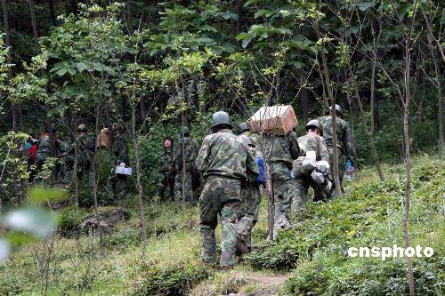 5月18日,中共中央总书记胡锦涛在北川视察灾情时,听说蓥华镇北门村麻柳坪道路至今没有打通,灾民生活十分困难,当即要求空军派兵支援。中国空军125名空降兵精干小分队带着食物、药品徙步32公里,冒着不断发生的余震、通过37处滑波,第一个进入海拔1200多米的麻柳坪。图为空降兵首批小分队扛着药品食物、冒着高温向麻柳坪开进的情景。中新社发 谭超 摄