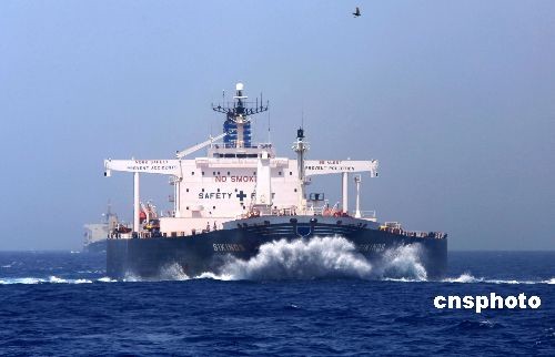 4月16日,中国海军第一、第二批护航编队在亚丁湾海域实施第二次共同护航。图为商船“西基诺斯”号(SIKINOS)在护航下乘风破浪前进。 中新社发 孙自法 摄