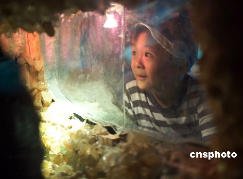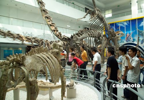 2006年10月6日,游人在参观中国地质大学(武汉)逸夫博物馆内的恐龙化石。中国地质大学逸夫博物馆,建设面积9777平方米,陈列展示面积5000平方米,是全国科普教育基地和全国青少年科技教育基地。该馆通过声光电的科技手段,栩栩如生地呈现了38亿年来地球上的生命演化过程。“十一”长假期间,众多武汉市民和游客纷纷来此参观。中新社发 宋建春 摄