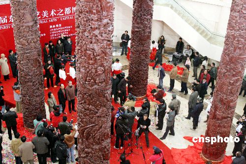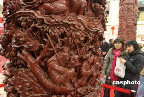 | 2007年1月13日,在江苏首届东方工艺美术之都博览会开幕式上,一组被评为“东方珍宝”的“四大明柱”木雕作品,吸引了观众。据了解,这组木雕作品以《三国演义》、《西游记》、《红楼梦》和《水浒传》等四大名著为创作题材,由来自江苏、浙江、福建和江西四地百余位雕刻人员,历时7个月雕刻完成。“四大名柱”高约10米,直径超过1米,每根柱子重约7.5吨,它展现了江苏红木雕刻、浙江东阳木雕、福建木雕和江西木雕的技术精华,代表中国当代木雕工艺的最高水平。中新社发 孙忠南 摄