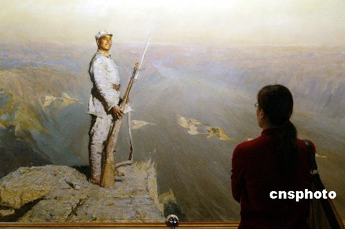 五月九日,已故中国当代著名画家陈逸飞的成名作《黄河颂》亮相中国嘉德2007春季拍卖会预展。该画作创作于1972年,1977年曾入选全军美展,它不仅是陈逸飞“最得意的作品”,也是中国写实主义油画的重要代表作之一。 5月13日上午,该画作将被拍卖,估价超过2200万元人民币。中新社发 张炜 摄