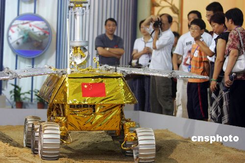 七月五日,第二届上海国际航空航天技术与设备展览会在上海展览中心举行。中国自行设计研发的月面巡视探测器(简称月球车)吸引了众多参观者的目光。中新社发 汤彦俊 摄