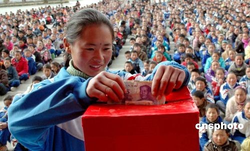 3月23日,拉萨市堆龙德庆县中学的1825名师生向“3•14”事件受害群众捐款,同学们拿出平时节省的零花钱,踊跃地向受害群众献爱心。3月14日,拉萨市区发生打砸抢烧严重暴力犯罪事件后,拉萨市社会各界纷纷强烈谴责达赖集团的罪恶行径,同时纷纷捐款捐物关怀受害人民群众。 中新社发 李西闻 摄