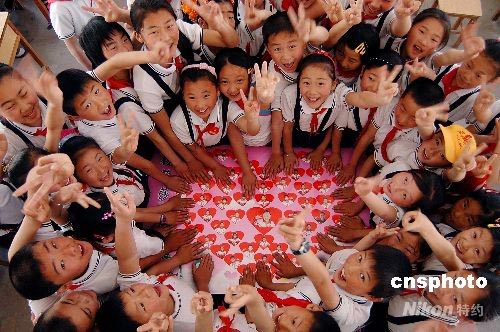2008年5月30日,来自四川绵阳地震灾区、在日照市经济开发区第二小学上学的3名学生,在新学校与老师同学们欢庆“六一”儿童节。日照经济开发区第二小学的师生为3名同学送上精美礼物,祝福他们和四川地震灾区的小朋友节日快乐。近日,山东日照市教育部门安排3名投奔亲友的四川地震灾区小学生就近在日照经济开发区二小上学,学校为这3名学生捐赠了学习用品,并减免费用。中新社发 陈为峰 摄