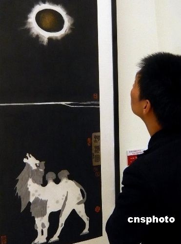 10月14日,在北京中国美术馆展出的“首届中国城市艺术书画家提名展”吸引参观者,该展由中国城市发展研究会城市艺术专业委员会主办,展览汇集了中国当下具有较高艺术成就的书画家的作品,旨在提升全国城市文化品味,促进书画家走向社会,服务于社会,是当代书画家参与经济发展,城市建设,传承民族文化的桥梁和纽带。图为展览作品之一《大漠长河》。中新社发 钱兴强 摄