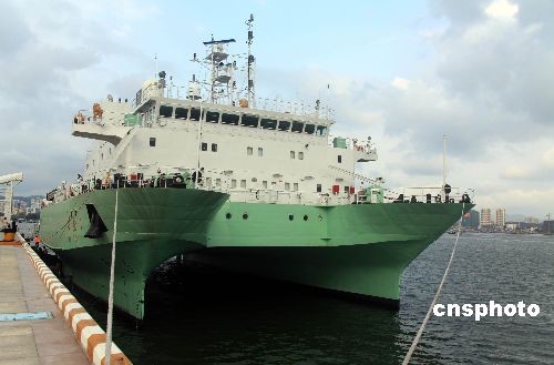 5月9日下午,中国科学院“实验1”号新型综合科学考察船将在海南三亚举行首航仪式。图为5月8日傍晚“实验1”号综合科考船停泊在三亚凤凰岛码头。中新社发 孙自法 摄