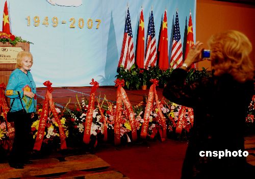 中国驻洛杉矶总领馆在国庆节前夕举办招待会,美国友人身穿华服出席,在中美国旗和花篮前拍照念。中新社发 贾国荣 摄