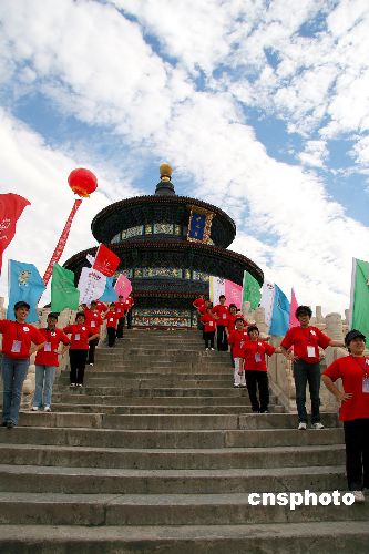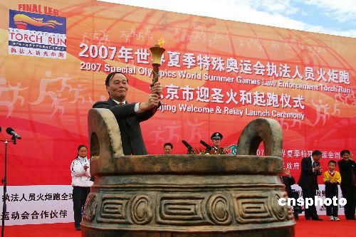 9月27日,2007年世界夏季特殊奥运会的火炬传递跑活动在北京举行。此次火炬传递路线是由天坛祈年殿出发,经台基厂—前门—天安门—府右街—景山—地安门—平安大街—什刹海荷花市场-最后到达什刹海社区。中新社发 富田 摄
