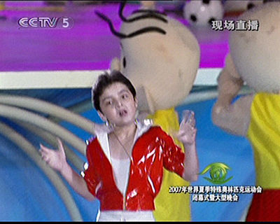 中国小歌星阿尔法与上海特奥会吉祥物“阳光三毛”共同劲歌辣舞。(电视截图)