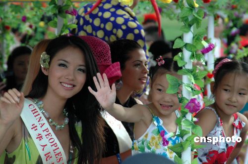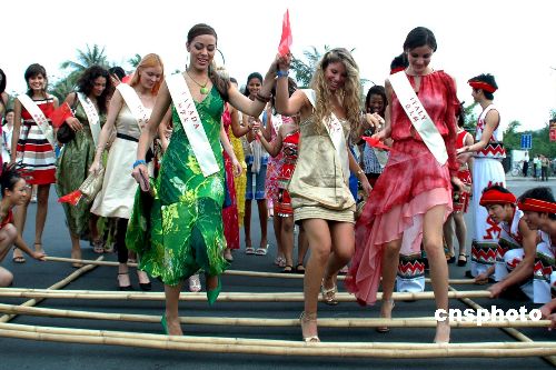 十一月十七日,参加第五十七届世界小姐总决赛的一百多位佳丽参加了海南岛欢乐节三亚分会场的活动,并在三亚市区巡游,与市民和游客们共享欢乐。中新社发 尹海明 摄