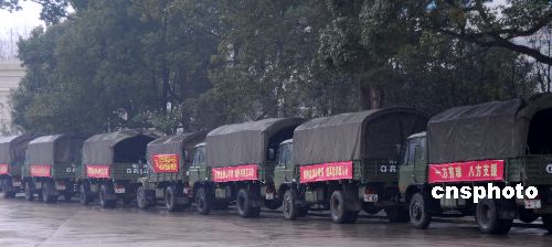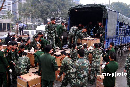 2月4日,雪凝天气尚未结束,贵阳地区又飘起了毛毛细雨,在省政府广场上,武警战士在装运重庆等省市支援贵州的救灾物资和小型发电机,准备运往此次雪灾中受灾严重的黔东南、黔南、铜仁、毕节等地区。此次持续20多天的雪凝凌冻天气,使贵州省70多个县市受灾严重,部分县市停水断电已近20天。中新社发 欧阳昌佩 摄