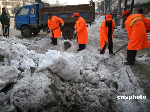 2008年2月7日,大年初一,安徽蒙城县环卫工人放弃休息,对市区主要道路人行道上的积雪进行清理,以辛苦劳动为欢度春节的市民营造良好的出行环境。中新社发 胡卫国 摄