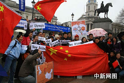 图:伦敦特拉法加广场上欢迎火炬的中国留学生(2)